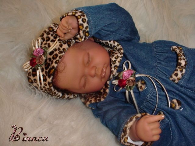 "Many babies on the reborn market in April 2002 had straight-hair wigs or wigs that had too much hair for a baby. The lips were also either too pink or too red. Berenguer only offered the African-American dolls in one shade and we all know that AA people come in a wide variety of shades. The eye colors available were always just the standard brown without any variation. No one at the time was dyeing dolls to achieve the rainbow of AA coloring. I think the hair bothered me most of all. I wanted a baby w/ curly or at least wavy hair that was more realistic looking." The picture below is a one of Stephanie's first reborn dolls.