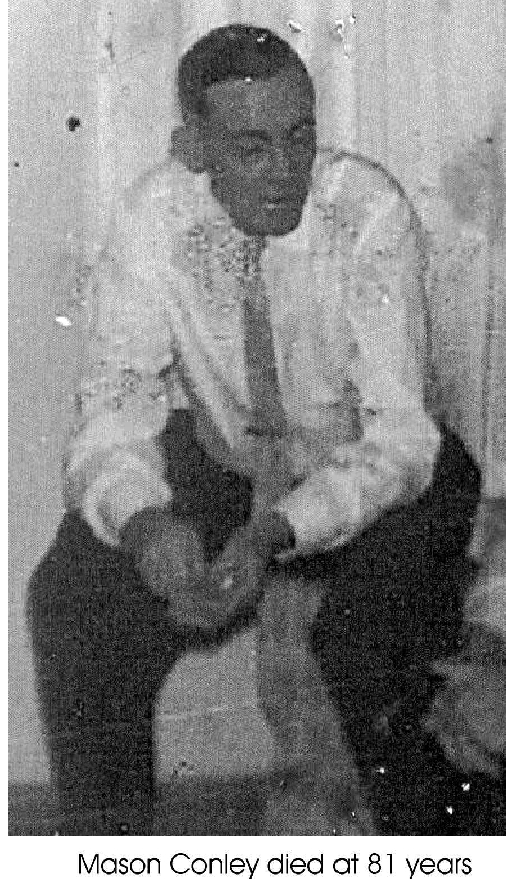 - Mason Conley my old uncle, ever since I was a little boy Mason always told me that I was his nephew. He would come by our old home place call me out and give me a drink of moonshine in a can lead when I was very small. Rub my head I always respected him. When I was younger he had two step son’s, Roscoe and Orville that I played with a lot. They lived across the hill from where we lived. They were a lot of fun. He also had a step daughter by the name of Dora Bell. He had about 9 children of his own, Gerldine, Nancy, Rosa, Susan, Mary Lou, Philis, and three boys