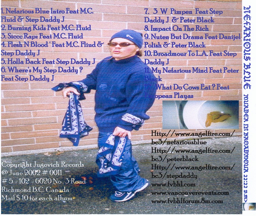 Ya'll be playing this C.D. all night and day long ! It's got guest appearences from Step Daddy J , Peter Black , Danijel Polish and the rest of the European Playas and Introducing from East Vancouver : M.C. Fluid ! This guy brings new meaning to the word siccc !! This is just the beginning of the East Vancouver Invasion of Jugovich Records . Step Daddy dun found a lot of rappers out of East Van and they'll be collaborating on his next few projects .....