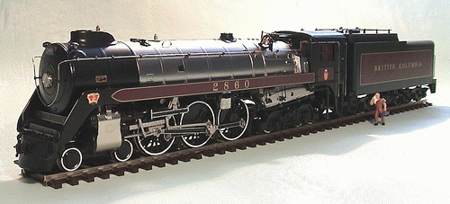 | There are eight versions (14 Road Numbers) produced: Quantity Road No. 2860/2864 Painted black with maroon panels, dark grey boiler. Oil tender------------------------30 units Road No. 2855/2859 Painted as above. Rectangular smoke stack. Coal tender-------------------------------37 units Road No. 2860 Painted maroon, black with a metal finish on the boiler. Oil tender--------------------50 units Road No. 2850 Painted in mid blue, dark blue and metal finish on boiler, cylinders,firebox----------172 units Road No. 2800/2809 Painted in maroon, grey and black. No smoke deflectors-------------------------------33 units Road No. 2805/2800 Painted as above. With smoke deflectors. Coal tender----------------------------------30 units Road No. 2816/2818 Painted as above. No smoke deflectors and no air reservoir tanks. Coal tender------49 units Road No. 2816/2810 Painted as above. With smoke deflectors and no air reservoir. Coal tender-----------32 units (Much thanks to Ron J. Small, Van Hobbies who has provided the quantities of their production found on this page) |