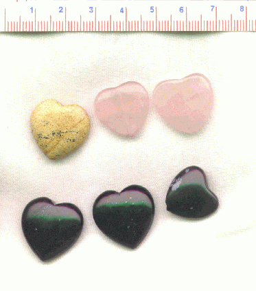 Stone Heart Beads These beautiful hearts are drilled top to bottom for stringing, wire or head pin. The Fancy Jasper, Black Obsidian and one Rose Quartz are 20mm wide.