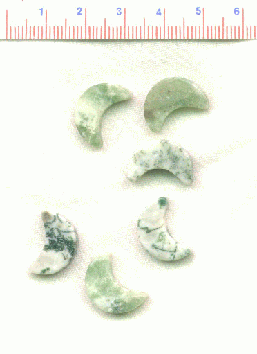 Crescent Moons Green and white Jasper, the way the stringing hole run from one end of the arc across to the other,