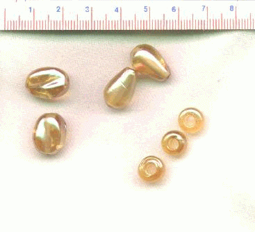 Champagne Color Beads Three different beads with a lovely champagne luster color; 1) Twisted-flat Oval, 15mm long and 10mm wide. Only 30 in stock.