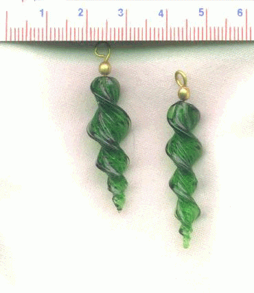 Green Icicle Pendants I got these with a batch of mixed glass beads. Made some earrings with them, but maybe you can come up with another idea. 40mm long with loop. Only 8 in stock. |