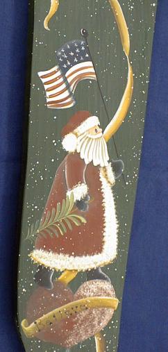 This wooden Santa is adorable to hang alone or in a wreath. The Santa is hand painted and comes in barn red and hunter green. Decorative accents of a wool beard and a pine wreath with cloves add to the wintery piece. The Santa measures 15" tall. The Santa is signed and offered by Brushworks. Cost for the Santa in the Stocking is $15.00 plus $4.50 shipping and insurance.