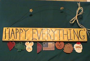 The sign measures 22" long by 4" wide and features a snowman, heart, shamrock, bunny, flag, school house, pumpkin, turkey, and pine tree with snow. Cost for the Happy Everything sign is $20.00 plus $5.50 for shipping and insurance.