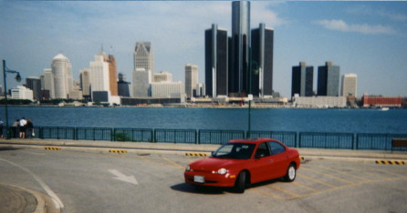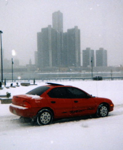 This is my Neon again down by the river on a clear winter day. In the Background is the Ambassador Bridge, spanning the Detroit River between Canada and the USA.