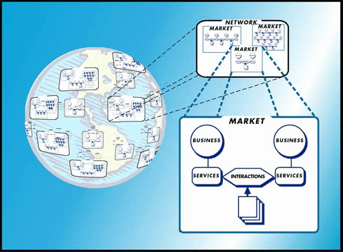 To help put the eCo Framework in perspective, Figure shows an instance of the eCo framework at work. Using the eCo Architecture specification, the figure illustrates the following e-Commerce scenario, "two companies are represented as eCo Businesses (implementations of the eCo Business Layer.) These Businesses exist together in an eCo Market that provides a venue for the type of e-Commerce that they are conducting. The eCo Market is indexed within a Network of Markets so that it can be located on the Internet. Each of these Businesses offers a set of e-commerce "Services" to each other. Each Service represents an interface to a business process. Example Services might be "Become a VAR", "Order some product", or "Review a catalogue of products." At the highest level, Businesses interact by using the Services of each other."