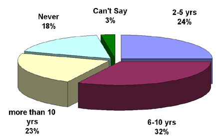 The question was about the period of time that credit cards and other electronic modes of payments would take to replace ordinary payment systems like cheques or cash. The response to the above question could be any of the four time periods, 2-5 years, 6-10 years, more than 10 years and Never.