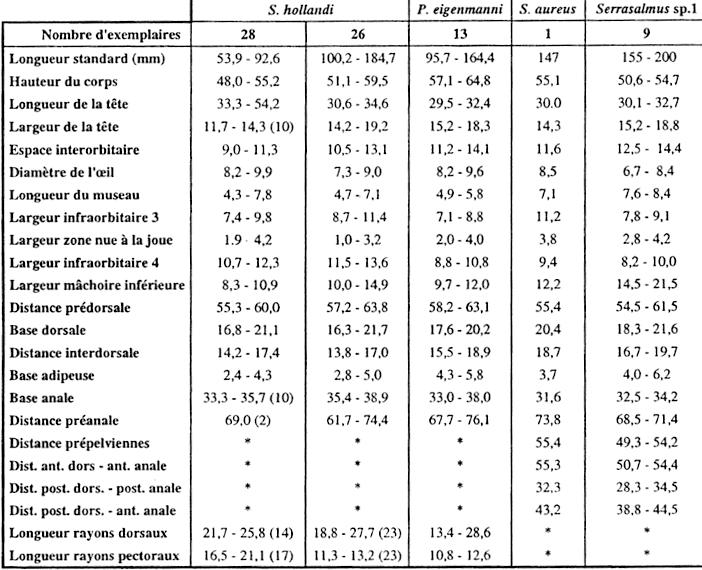 In P. eigenmanni, S. spilopleura, the muzzle is short and pug, narrow infraorbital bones (Fig. 8c 8e) and the large gap in the cheek (Fig. 8d). P. eigenmanni is different types of S. spilopleura by body height (Fig. 8a) and the insertion of the dorsal farther back (Fig. 8b). Moreover, in P. eigenmanni diameter of the eye is slightly larger. Serrasalmus spilopleura and S. maculatus interdorsal distances and longer pre-anal and dorsal and pectoral more shorter than in S. spilopleura (Tableau! VII).