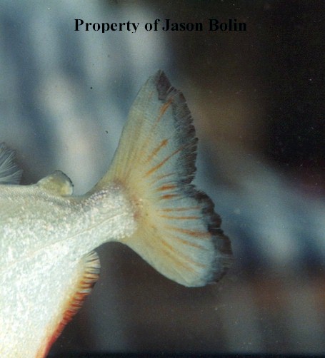 Recorded examples range from 30-35 cm total length. Aquarium specimens are usually smaller. Being the most common piranha found for sale in U.S. pet industry, these fish has provoked fear in conservationists and the media (see genus Pygocentrus VIEW). The fish are found in a variety of belly colors ranging from yellow-orange-red. Body colors are also as variable being; silver-gold-black. Some are so intensely gold-speckled that they are also commonly called "gold-dust piranha". The head shape of these piranhas also appear to be variable, some being very blunt-headed and having little to no concavity above the profile of the eyes. This has been attributed to the type of diet the fish is restricted to. This species is relatively small, with a 3- pound 7-ounce specimen holding the world angling record, River Cuiaba, Mato Grosso, Brazil. (Source: Field and Stream 2002). Some imported Pygocentrus type piranhas have been reported to lack the presence of the adipose fin or the adipose fin is reduced in size. Researchers are reminded that without the naturalness (synapomorphy) of the adipose fin the fish would not be a member of the subfamily Serrasalminae. Piranhas do bite each other and the loss of an adipose fin can be attributed to that. As for reduction in size, that depends on environmental factors and diet, after all the adipose fin is fatty tissue and not unreasonable to assume that an emaciated fish lives on its fat storage when faced with periods of drought. The area above the eyes (dorsum) is also seen in some wild caught specimens and the occasional pet trade piranha to appear very emaciated (skinny and drawn). This piranha must be encouraged to eat fish and other matter, since the dorsum area is a fat and muscle storage area. Hobbyists also look at body length to assume this character prescribes a different feature, Fink in his revision did a body comparison of all P. nattereri within its range and found nothing to suggest that elongation of the body is a specific feature in one locality. Indeed elongation is more an individualistic trait within populations of P. nattereri throughout its range. Some species like Pygopristis denticulata require the feeding of seeds VIEW (Magallanes, 1993) in order for the fish to replace this fatty tissue.