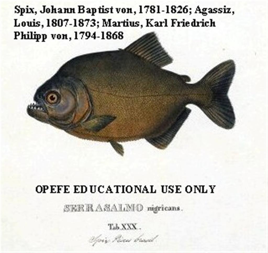 Pygocentrus nigricans, from "Equatorial Brazil," described by Agassiz (in Spix and Agassiz, 1829 Photo shopped to enhance color only |