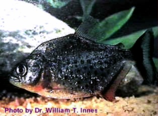 The species is very shy preferring to hide behind a rock or floating plant roots. Sometimes, the fish can be seen in the aquarium calmly approaching a victim, act as if it not going to bother it all. Sometimes, it just ignores the victim for a period of time. Then suddenly bite at that fishes fins. This type of stealth attack and feeding is a renewable resource of food for this piranha, since the fins are full of protein and grow back quickly. They are colorful and not uncommon to find them with bright red throats and diamond-like speckles on the body that shimmer in the light. The fish grows to about 17.8-20 cm SL (David Schleser, 1997).