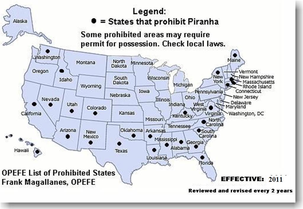 Some States above do not reflect Fish & Wildlife Rule Making Authority which may prohibit piranhas in individual States where they may appear to be legal.