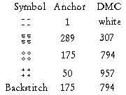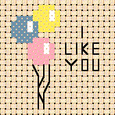 Sometimes a colour will have only a few stitches and then "jump" to another area. Most of the time you should end off and start again, other times you can carry the thread along the back. Just jumping from area to area is easier than starting and stopping, but sometimes the thread will show through. This can be a problem if you jump a dark thread over an unstitched area of light fabric. In general, you can carry the thread to another area if the jump is short, the floss colour is light, and you are jumping over a previously stitched area. In the "I Like You" graph, the white highlights on the three balloons can be done by starting at the top balloon, jumping to the middle balloon, and then jumping to the bottom balloon.