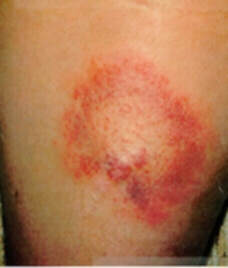 The rash can become relatively large - up to 75 centimetres (30 inches) in diameter - with gradual clearing of the erythema (redness) from the centre, so that the skin returns to its normal appearance. This phenomenon has given rise to the term "bulls-eye rash". Some rashes may be very faint, with little or no swelling or raising of the advancing edge, and may be easily missed, especially if the person has dark skin or the bite is in an inconspicuous site. The patient may also experience other symptoms, including a mild 'flu-like' illness and swelling of the lymph nodes (glands) of the area affected by the rash. If these symptoms are severe or accompanied by marked arthralgia (joint pains), myalgia (muscle pains), headache or neck stiffness, it is likely that there has been some secondary spreading of the infection to other parts of the body.