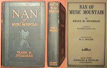 Nan of Music Mountain by Frank H. Spearman, 1916 first edition by Grosset & Dunlap (by arrangement with Scribner's) - 4 b&w illustrations by N.C. Wyeth. Blue cloth cover with impressed saddle design and red colored lettering - about 5 1/4" x 7 5/8" - 430 numbered pages plus 8 pages of ads. In VERY GOOD condition - normal wear/tear - no DJ - owner's inked name on front page. $100.00