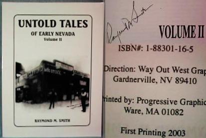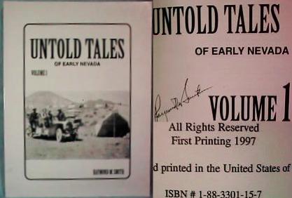 Volumes I & II of Raymond M. Smith's Untold Tales of Early Nevada. Both softcovers, about 7 1/2" x 10", are author signed and in MINT condition. Vol.I, 201 numbered pages, is a 1997 First Printing. Vol.II, 161 numbered pages, is a 2003 First Printing. They are loaded with stories and tall tales of the early days in Wild West Nevada, and contain many b&w photos. $150.00