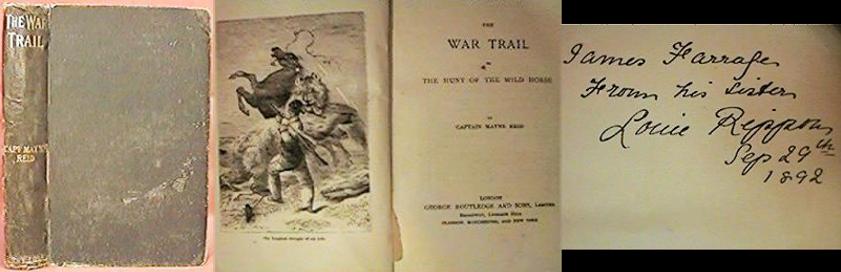 Cloth covered hardback novel of high adventure on the American Southwest frontier by Captain Mayne Reid titled: "The War Trail or The Hunt of the Wild Horse." Published by Routledge, undated, but inked owner inscription at front is dated Sep 29th, 1892. About 5 1/4" x 7 1/4", no DJ, complete, 418 numbered pages plus several pages of ads. Engraved print at frontis - in overall GOOD condition, inside in VG condition - cover shows considerable wear/tear. $100.00