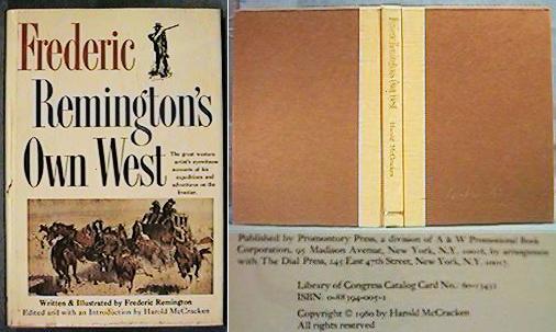 "Written & Illustrated by Frederick Remington - Edited and with an Introduction by Harold McCracken - The great western artist's eyewitness accounts of his expeditions and adventures on the frontier." Copyright 1960 by McCracken - published by Promontory Press unknown date - in FINE condition, hardcover with gilded lettering, about 7 1/8" x 10 1/4" - 254 numbered pages. Original DJ is in VG condition showing some wear/tear - it has the retail price PLUS the reduced price sticker. $90.00