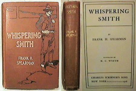 Whispering Smith by Frank H. Spearman, with 4 wonderful color illustrations by N.C. WYETH, published in 1906 (lst American edition/printing) by Charles Scribner's Sons of New York. Red cloth cover with impressed multicolored design - complete, 421 numbered pages plus 2 pages of ads - no DJ - shows normal wear/tear - tissue guard. In VERY GOOD condition - flaws, if any, are as published. Another one of the great early western novels that contributed to the American cowboy myth. About 5 3/8" x 7 3/4". $185.00
