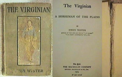 A cheaper hardcover edition of Owen Wister's classic "The Virginian" - this particular copy appears to have been published (as a reprint) in February 1904. It contains no illustrations inside, but there is a multicolored litho print affixed to the front cover which shows much wear/tear (POOR condition and separated from the spine). But, the inside is VERY GOOD with 504 numbered pages PLUS 4 pages of ads. About 5"x7 1/4". $75.00