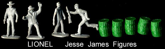 Lionel Jesse James 30/35mm figures, some damaged + barrels.