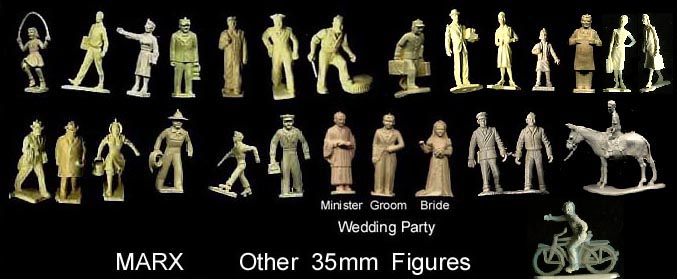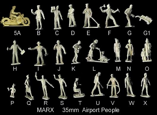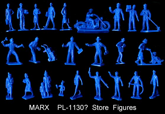 Marx reissue PL-1130 Store People; 24 35mm Figures + dolly in blue or gray. The first five in the top row are not airport figures so we think Marx borrowed the other poses from their airport figure mold and added them to these new five poses to make their store people. We would have replaced the man with batons with the newsboy.