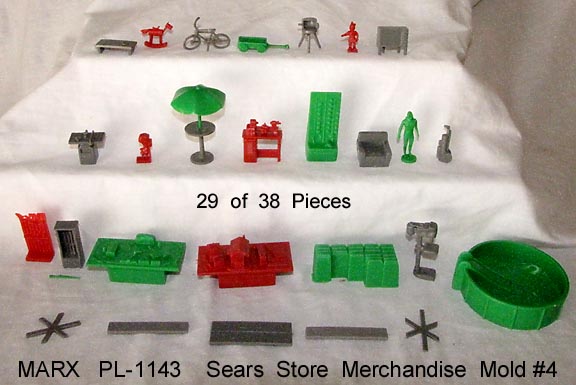 Reissue Marx "Sears Town Playset" store accessories/merchandise for their 30mm figures. We got 29 of the original 38 pieces that were made in this mold.