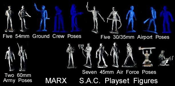 For their S.A.C. Playsets Marx borrowed figures from other sets, reducing some from 45, 54 and 60mm sizes down to the smaller 30mm size. This allowed them to fit in better with the even smaller scale planes. They can be found in silver and blues.