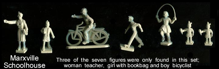 The Marxville school house came with seven figures. The woman teacher, girl carrying book bag and boy on the bicycle were only made for this set.