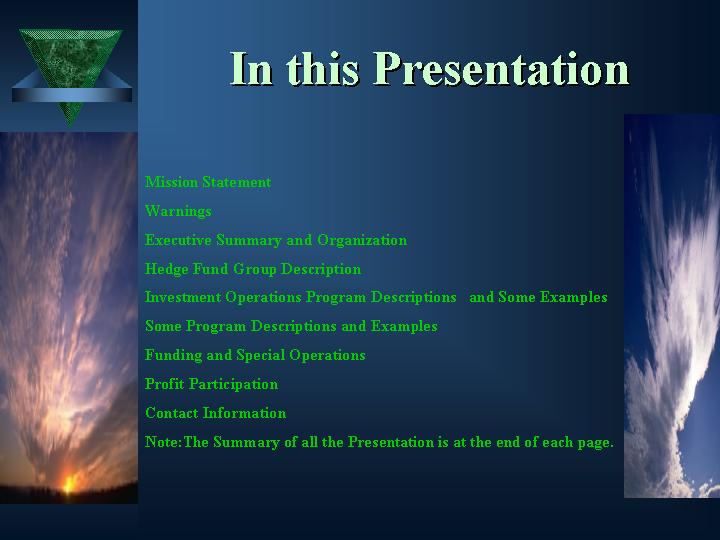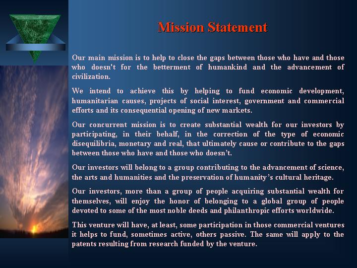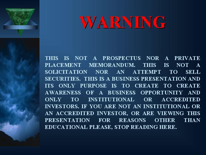 A web site directed to actual qualified investors will be available soon and its access restricted to those submiting the necessary information to allow us to entertain the possibility of an investment participation.