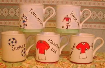 Here are our hand painted football mugs. We can do these styles in any team you wish with any message for only £3.95 (plus £1.00 P & P if required [U.K.]). Please note if you are a club we can supply in bulk and you can save pounds, just contact us for details, use them for fund raising or end of season gifts.