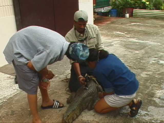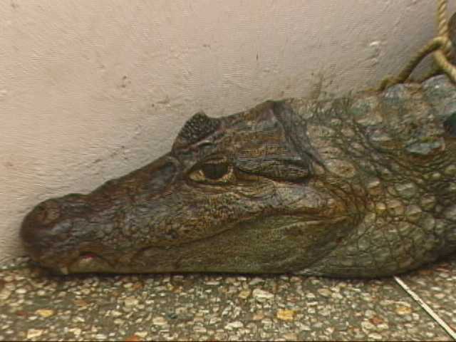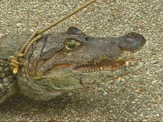 the caiman wandering around the lady's yard and managed to rope and tie up