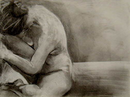 A study in charkol on paper from Life Studies class. This is one of the first pieces I produced in that class in which I tried to show the mood and feelings of the model through manipulation of the atmosphere and placement on the paper.