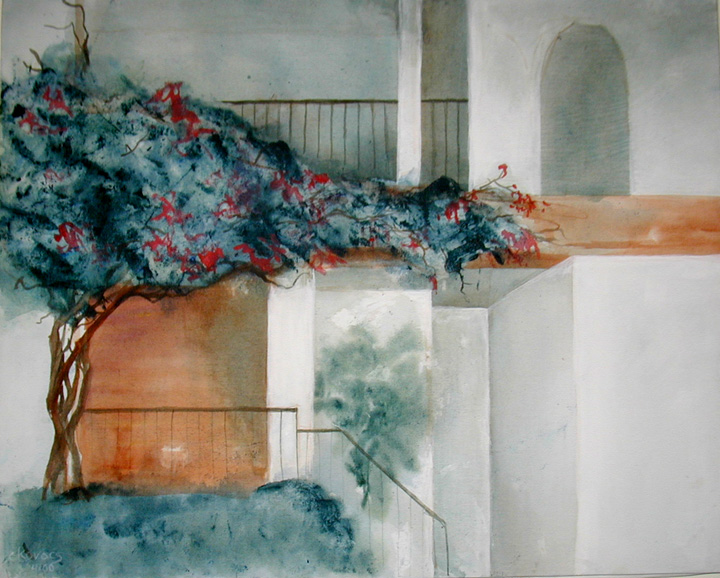 HoltaiHoltai was painted mostly on site outside a local resaurant. The tamed wildness of the bouganvillia created a wonderful contrast against the cool white walls of the resaturant and claimed my interest. It was painted in acrylics on a 2' by 3' canvas for the Multimedia Trees course.