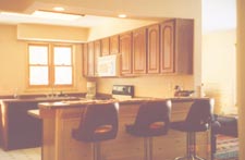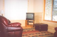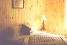 Apartment 1: This two bedroom apartment, adjacent to the lodge, was remodeled in September 2005 and has central air conditioning and a full kitchen with a breakfast bar and dishwasher. The living area has wood floors and a large picture window offering a panoramic view of the lake. Enjoy satellite TV and WiFi internet access. The master bedroom has a queen size bed. The second bedroom is furnished with two twin beds. A full size "Murphy Bed" is hidden away in the living area and provides sleeping for two. The bathroom features a full sized tub/shower unit. Ceiling fans provide gentle breezes in all the rooms. The apartment has a secure and private entrance and a private 200 sq ft deck providing space for cookouts and just relaxing on clear summer evenings. The apartment has all the comforts of home with the feel and look of the Northwoods.
