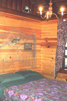 This is a our most private unit. This three bedroom log cabin features a large three season porch. Knotty pine walls provide a warm charm to the comfortably furnished living area. Each bedroom has a full sized bed. A central ceiling fan provides gentle breezes through the open rafters.