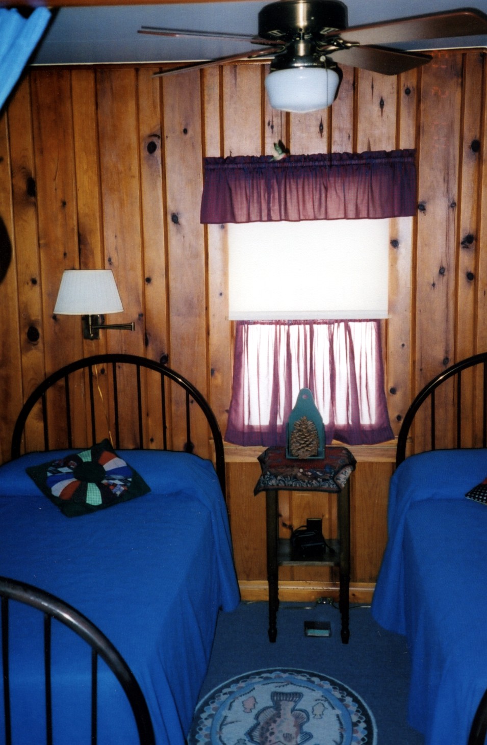 Cabin 3 is a charming two bedroom cabin perched on a hill over looking the lake. Enjoy the sun setting over the lake from the comfortable three season porch. The bedrooms are furnished with one full bed and two twin beds.
