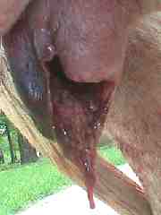 Less than 36 hrs later the tissue became necrotic and sloughed off on one side. Bloody discharge drained from the teat accompanied with what appeared to be milk.