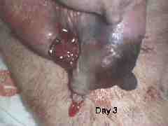 After 48 hrs approximately 1/3 of the necrotic tissue of the nipple remained exposing what appeared to be healthy tissue inside of the deep cavity of the teat. Drainage reduced to a sepage."
