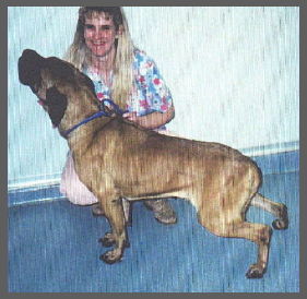 This picture (above) is of "CHILLICOTHE THREE" - SWEETIE. Sweetie's physical description is: 3-4 yrs old, 101.4 lbs, emaciated, skull, shoulder, ribs, and hip bones protrouding. Numerous calluses all over body at pressure points where bone is right next to skin. Looks as if she recently whelped puppies. Her emotional description: cautious, unsure of humans, does warm up to you with affection. Sweetie was adopted |