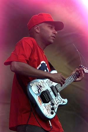 If you haven't heard of Rage Against The Machine, you must be living in a cave. They were basically the first band to fuse rap and metal together. Other groups and rappers had previously collaborated for singles, but never for a whole album. Even though I didn't hear their first album until years after it had been released, it still hit me as a new and original sound. Rage is driven by a number of elements, the foremost, (in my book anyway,)being the unique riffs and solos produced by guitarist Tom Morello. His non-traditional stylings make for unique songs, and always leave you waiting to see what kind of bizarre sounds he can produce next. Fronting the energizing rhythms produced by Morello and company, are the politically charged lyrics of Zack de la Rocha, which reflect the opinions shared by he and Morello (a self-proclaimed communist.) Bassist Tim Commerford and drummer Brad Wilk admit they're just in it for the music, and don't have the political zeal of their bandmates, but are necessary nonetheless. Every band needs at least one member with some crazy tatoos. I finally got to see Rage on Dec. 2 at the Baltimore Arena. I was really impressed. They played lots of songs from each of their three albums, and also did "No Shelter" and "The Ghost of Tom Joad." There was no crowd interaction at all, although Tom said a few words to the everyone before the show started.