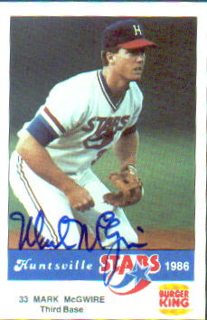 The next example I have is from 1986 in his minor league playing days. He signed quite a few of these Huntsville Stars cards for a card store in Huntsville. Notice the full name. You can read "Mark" very clearly and the M C G and W in McGwire. this is probably the clearest he ever signed his name. During Marks career the "G" in McGwire is the tell tale sign of the age of the autograph.