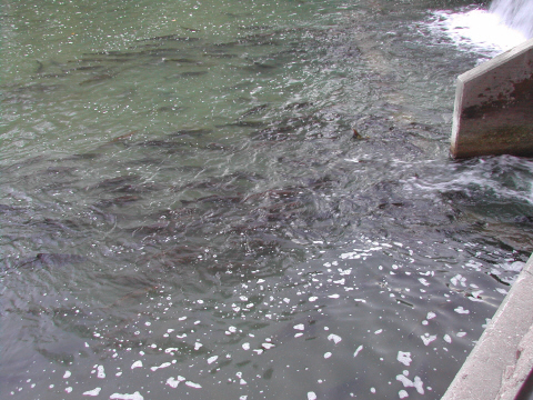 Hundreds of Salmon congregate at the base of the dam. Eventually many will make their way throught the fish ladder (located at the lower right corner of this picture) to the spawning grounds in the Sydenham River. |