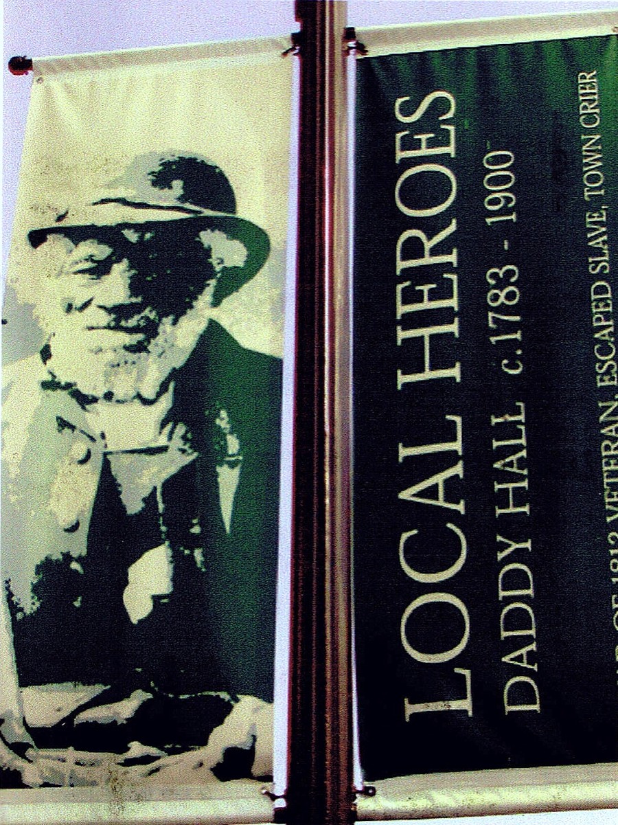 Owen Sound has a long history of association with its black community. An early stop on the Underground Railway network, this city recognizes from its past, Daddy Hall, a black man often referred to as our first town crier. Daddy Hall daily made announcements in front of City Hall. His face now decorates many street-lamp flags along the main street.