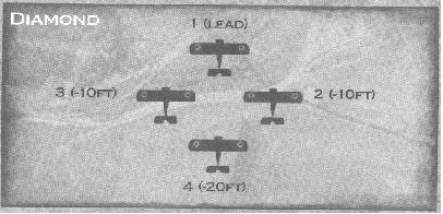 The diamond adds a plane to the Vee. The forth plane follows directly behind the lead and is at a 135 degree angle from slots 2 and 3. From the lead, slots 2 and 3 are 10 ft. below, and slot 4 is 20 ft. below.