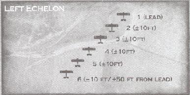 This is the simplest of formations. It can hold from two to twelve planes. Planes in the formations will line up off of the lead planes right or left side at a 135-degree angle. Each plane forms off its previous slot on the same side, at the same angle (2 forms off of 1, 3 forms off of 2, etc). Each plane is 10 ft lower or higher than the plane it follows. The Echelon forms the core of most other formations, and can be considered to be a generic or fallback formation. It can be used for takeoffs, landings, or patrolling the skies for enemies.