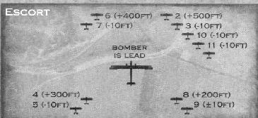 In this formation the bomber is lead. A few escorts will be behind the bomber in a Vee formation but about 100 ft above eachother. A few more will be in front of the bomber at higher altitudes to watch for enemy aircraft.