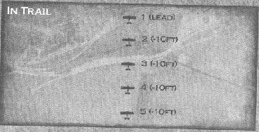 The In Trail formation is simply just a row of planes, each lined up behind the plane it follows. This formation can have from 2- 12 planes. This is a good takeoff formation. Its tactical use is limited, however.
